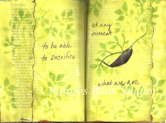 The theme of the altered book is Words To Live By. I used a quote by Charles Dubois that has been my guiding theme since the mid 1980's. The background is painted with yellow-green and citron paint, stamped and stenciled with leaves, and pages are tiered to display the quote in segments. The colors in the scan are not quite accurate, the pages have more green to them.